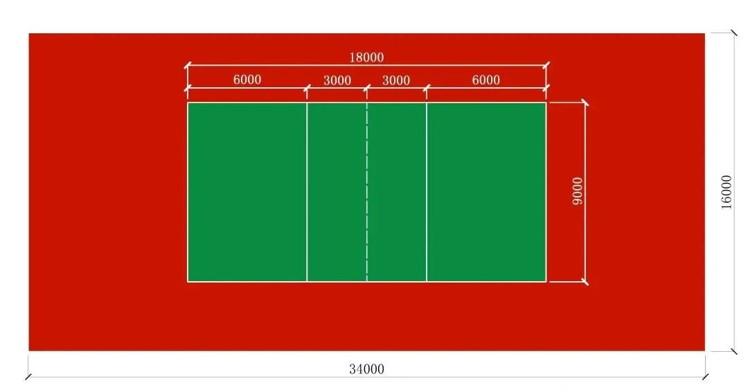 单打主场:长13.4米×宽5.18米,面积69.412㎡室内要求高度不低于9米
